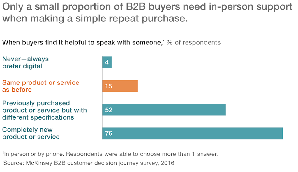 McKinsey fand – zur Überraschung vieler Sales-Teams – des Weiteren heraus, dass die Mehrheit der B2B-Einkäufer:innen sich nur dann eine persönliche Betreuung vom Anbieter wünschen, wenn das Produkt oder die Dienstleistung komplett neu ist oder neue Spezifikationen aufweist. Wenn es sich allerdings um Wiederholungskäufe handelt, bevorzugen 85 Prozent einen digitalen Self-service via Onlineshop.