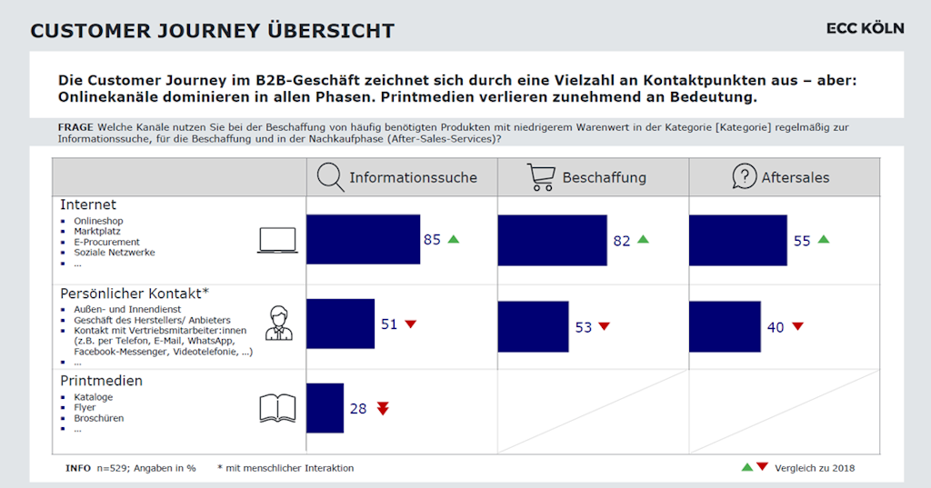 Laut einer Studie, die der ECC Köln in Zusammenarbeit mit Arvato, Intershop und Magento durchgeführt hat, wechselt die Mehrheit der B2B-Kund:innen mindestens bei jedem zweiten Informations- oder Beschaffungsprozess zwischen den Kanälen, z. B. online, persönlicher Kontakt und Printmedien.