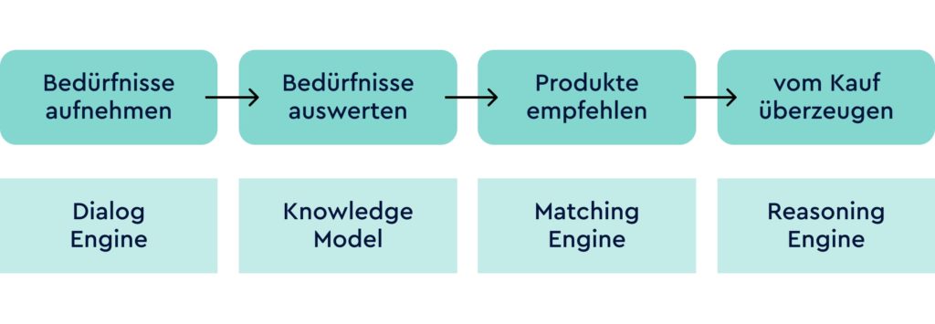 - Bedürfnisse aufnehmen: Kund:innen werden nach ihren Anforderungen befragt. Es werden die wesentlichen Eigenschaften der Produkte erklärt, anhand dessen Interessent:innen ihre Anforderungen formulieren und präzisieren können.