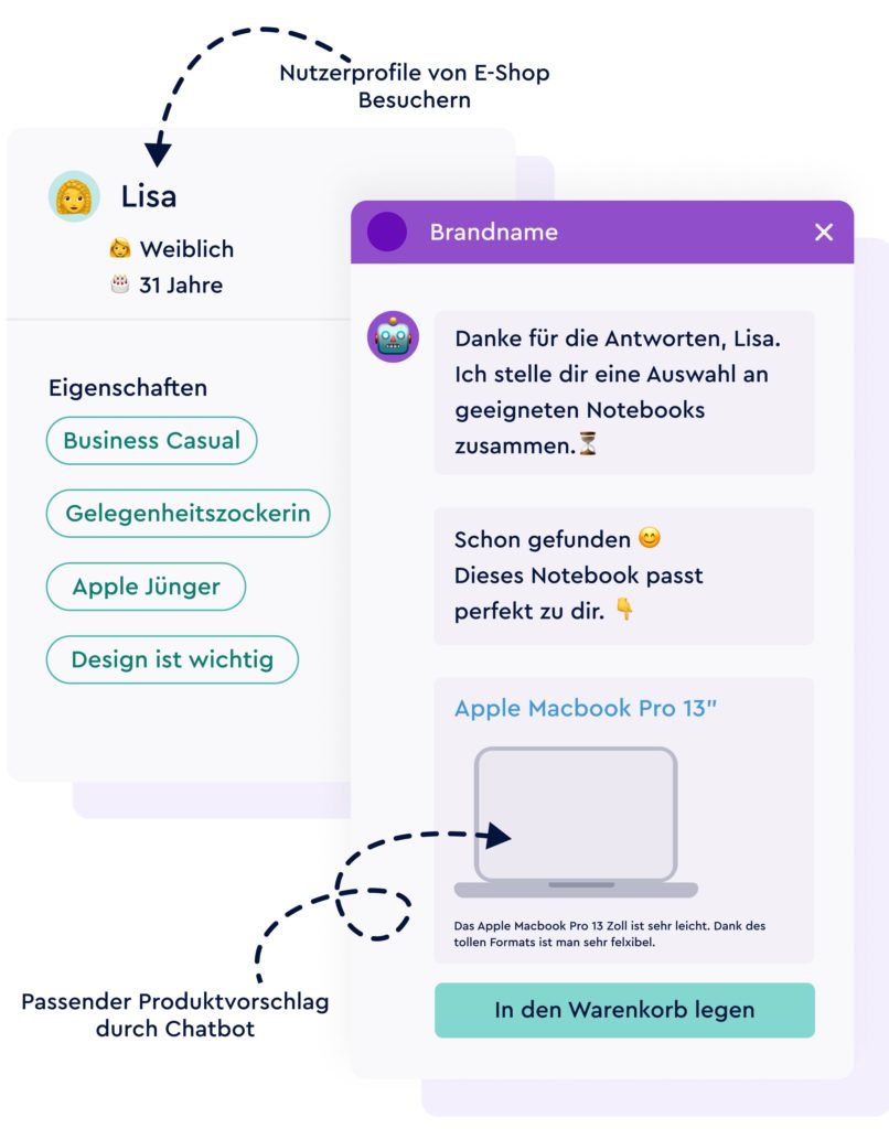 Chatbots lösen das Problem. Chatbots sind Systeme, die Nutzer:innen in einem natürlichen menschlichen Dialog automatisierte Fragen stellen und deren Antworten erfassen können. Dadurch können die Bedürfnisse der Konsument:innen interaktiv abgefragt werden. Anschließend sind entsprechende Produktempfehlungen im Chat direkt anklickbar.